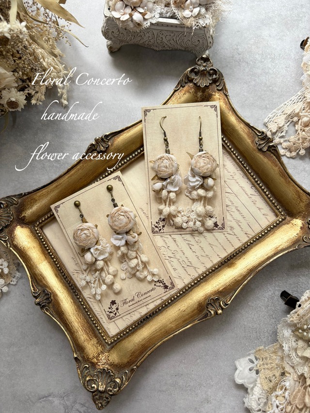 <商品説明> 紅茶染めしたお花とレース、かすみ草のプリザのイヤーフック。 右耳用 布花は真っ白な生地から染めて、 コテ当てして制作しています。 サイズ 縦16㎝×横3㎝ 金具のお色:金古美 金具の素材:メッキ ※在庫が2個以上の作品は、ハンドメイドでひとつひとつお作りしていますので、画像と雰囲気がすこし異なる場合があります。 ハンドメイドの作品としてご理解の上、ご購入をお願いします。 ※画像につきまして。 なるべく実物に近づけるように撮影していますが、光の加減や、端末の環境により、実物と少し異なる場合があります。 ご了承くださいますようによろしくお願いします。
