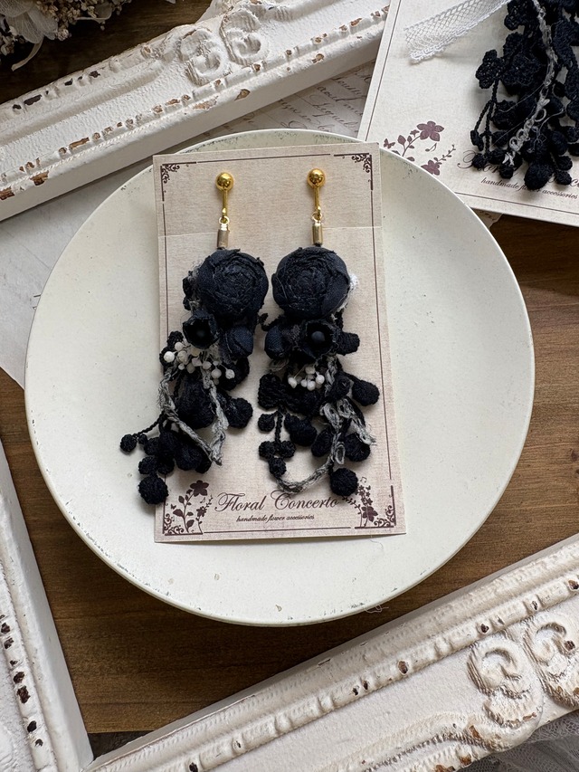 <商品説明> ミニ黒薔薇のイヤリングです。 布花は手染めしてコテあてをしてお花に成形しております。 サイズ 横 2㎝ ✖️ 縦7.5㎝ こちらはイヤリングですが、 ピアスに変更可能です。 ピアスをご希望の方は、 メッセージか備考欄にて その皆をお知らせください。 アンティークレースを使用しています。 経年劣化やシミ、汚れなどある場合があります。 風合いとしてご理解いただける方のみご購入ください。 ※画像につきまして。 なるべく実物に近づけるように撮影していますが、光の加減や、端末の環境により、実物と少し異なる場合があります。 ご了承くださいますようによろしくお願いします。