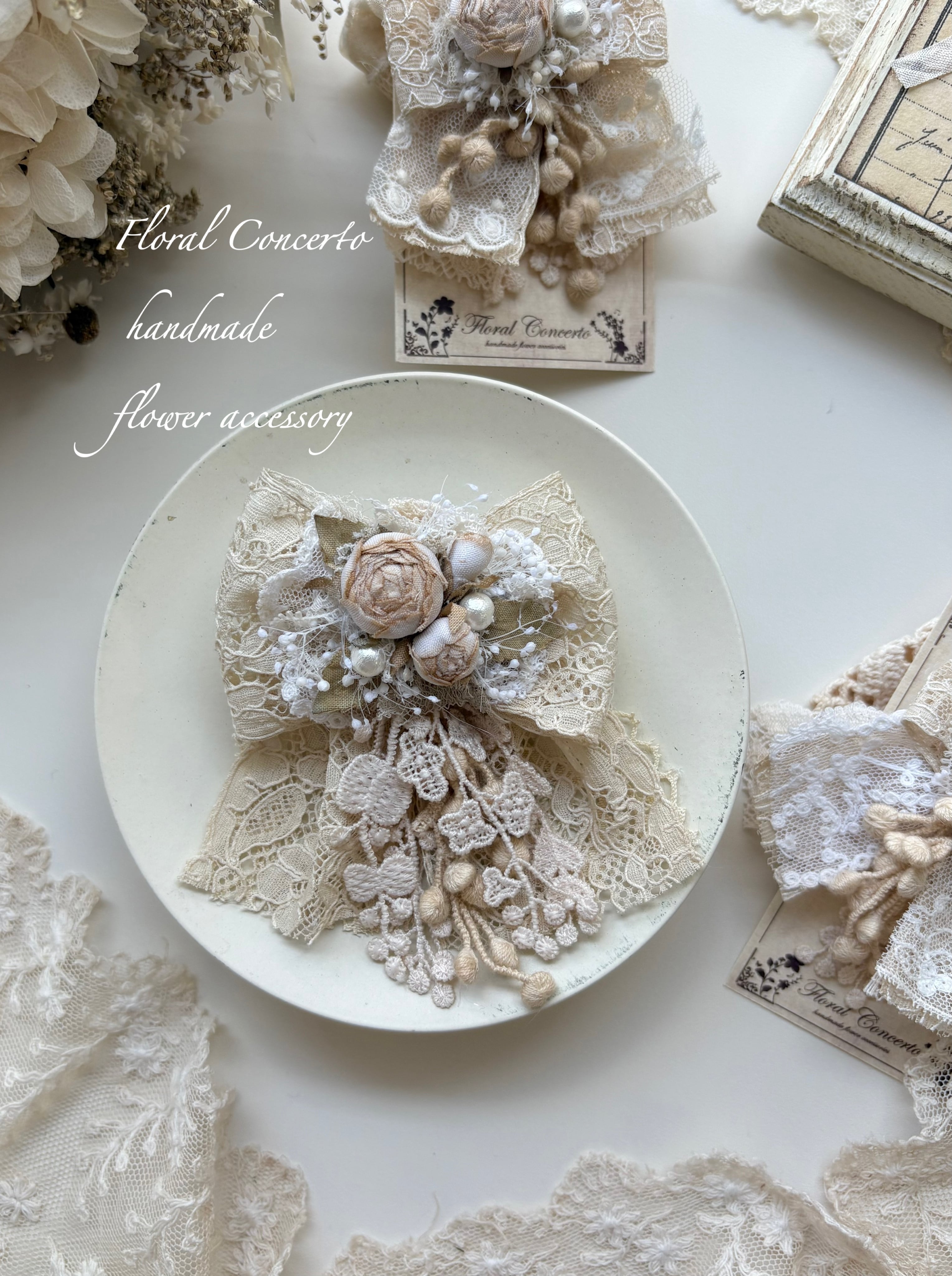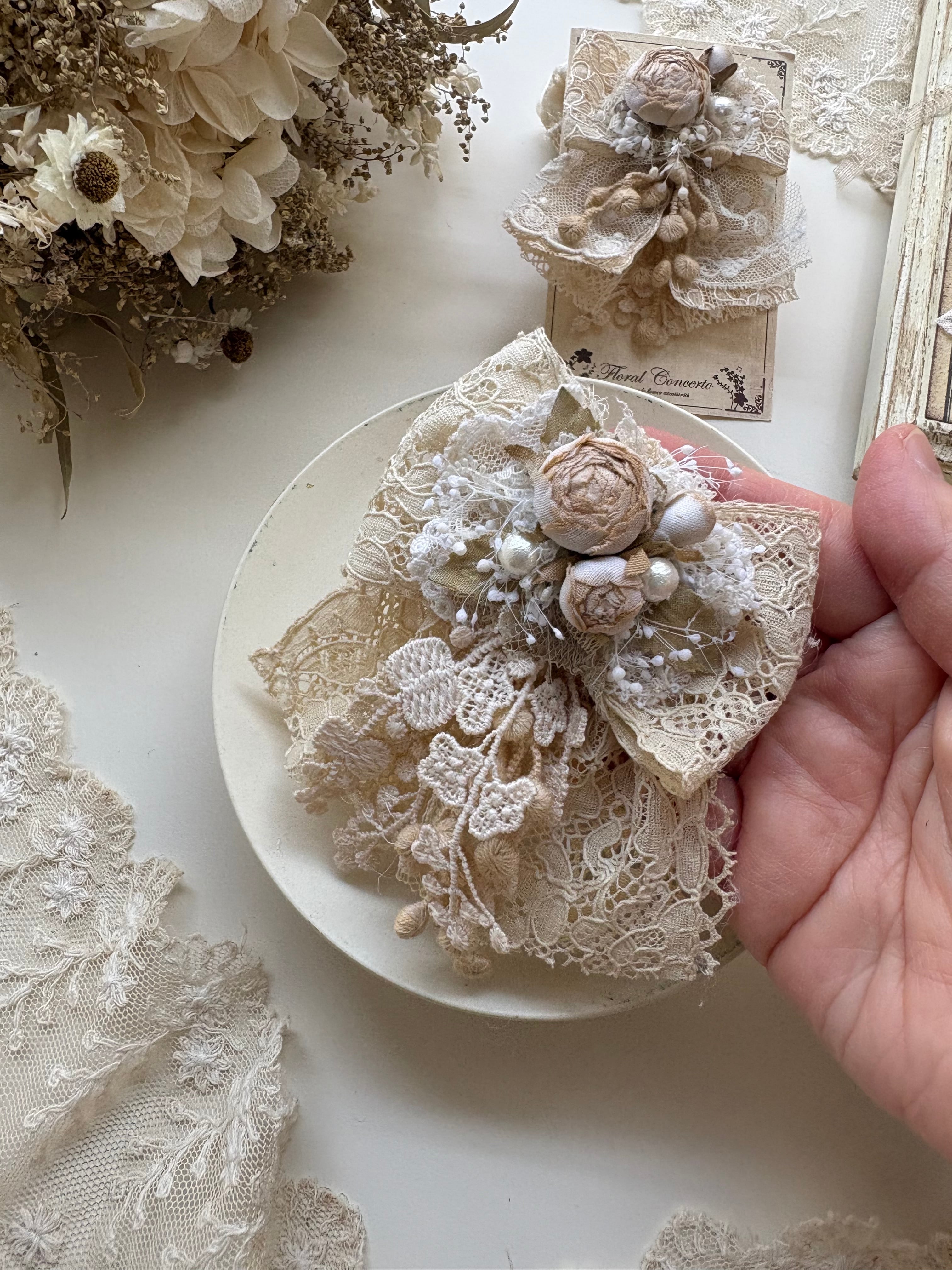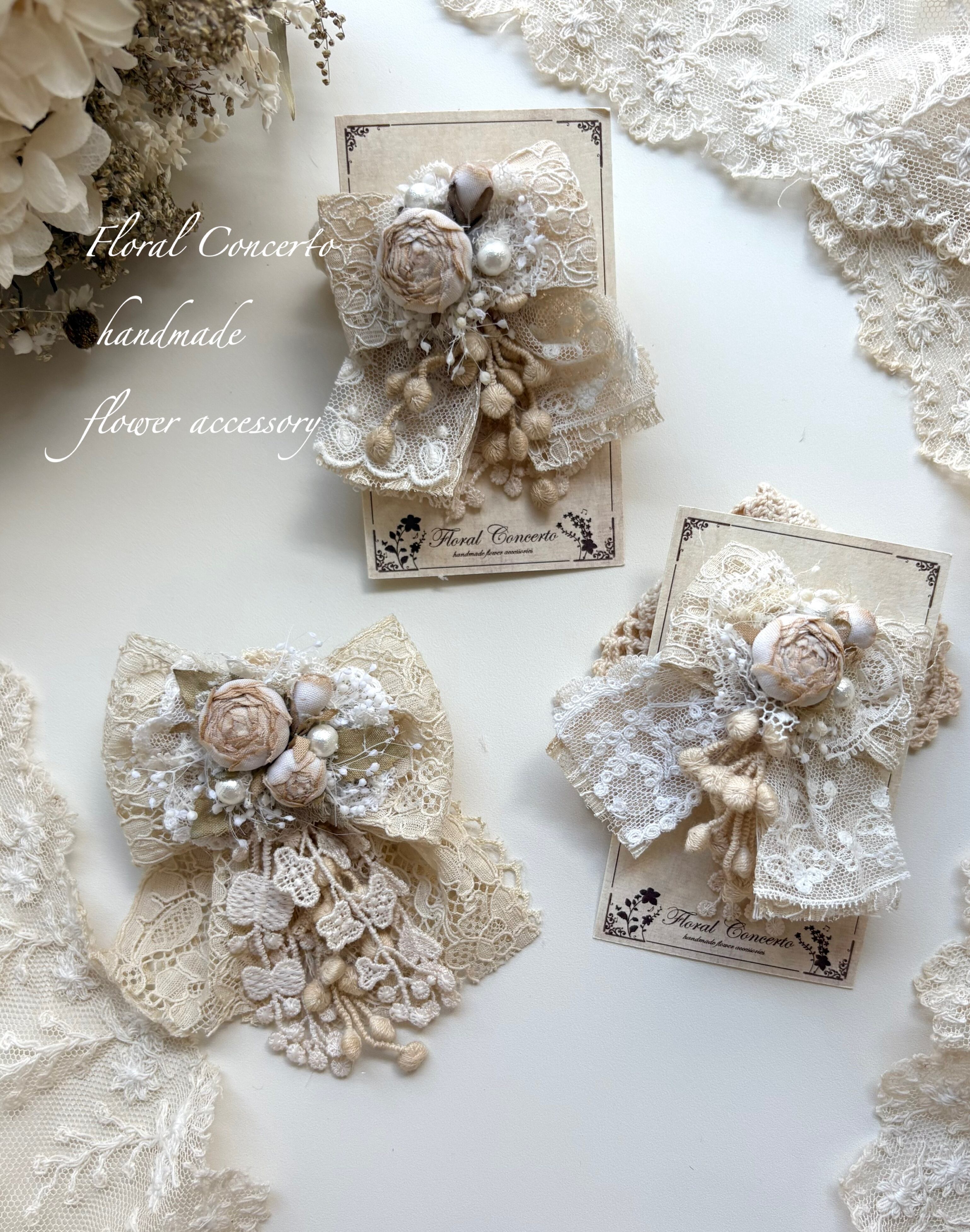 布花は手染めしてコテあてをしてお花に成形しております。
