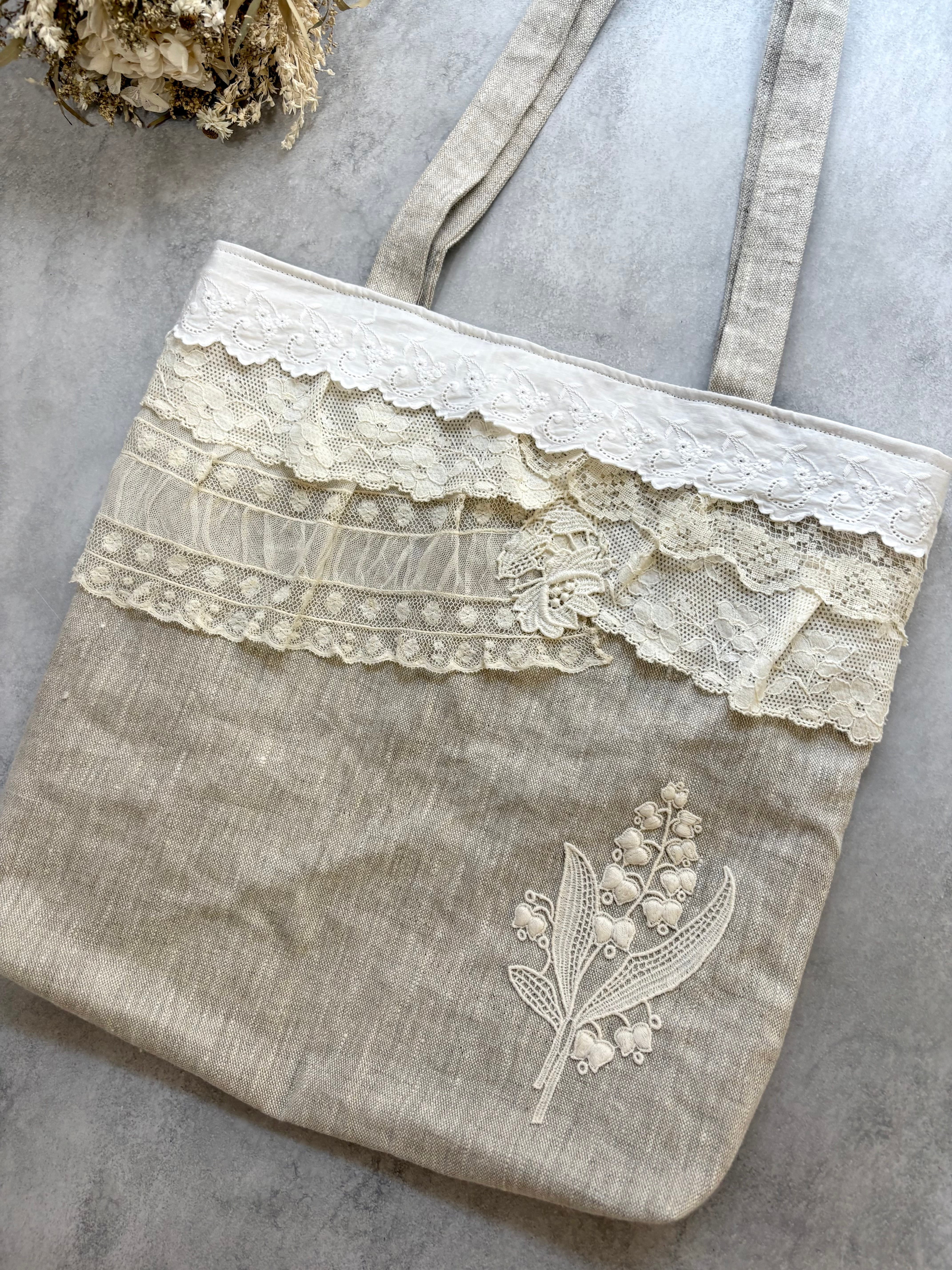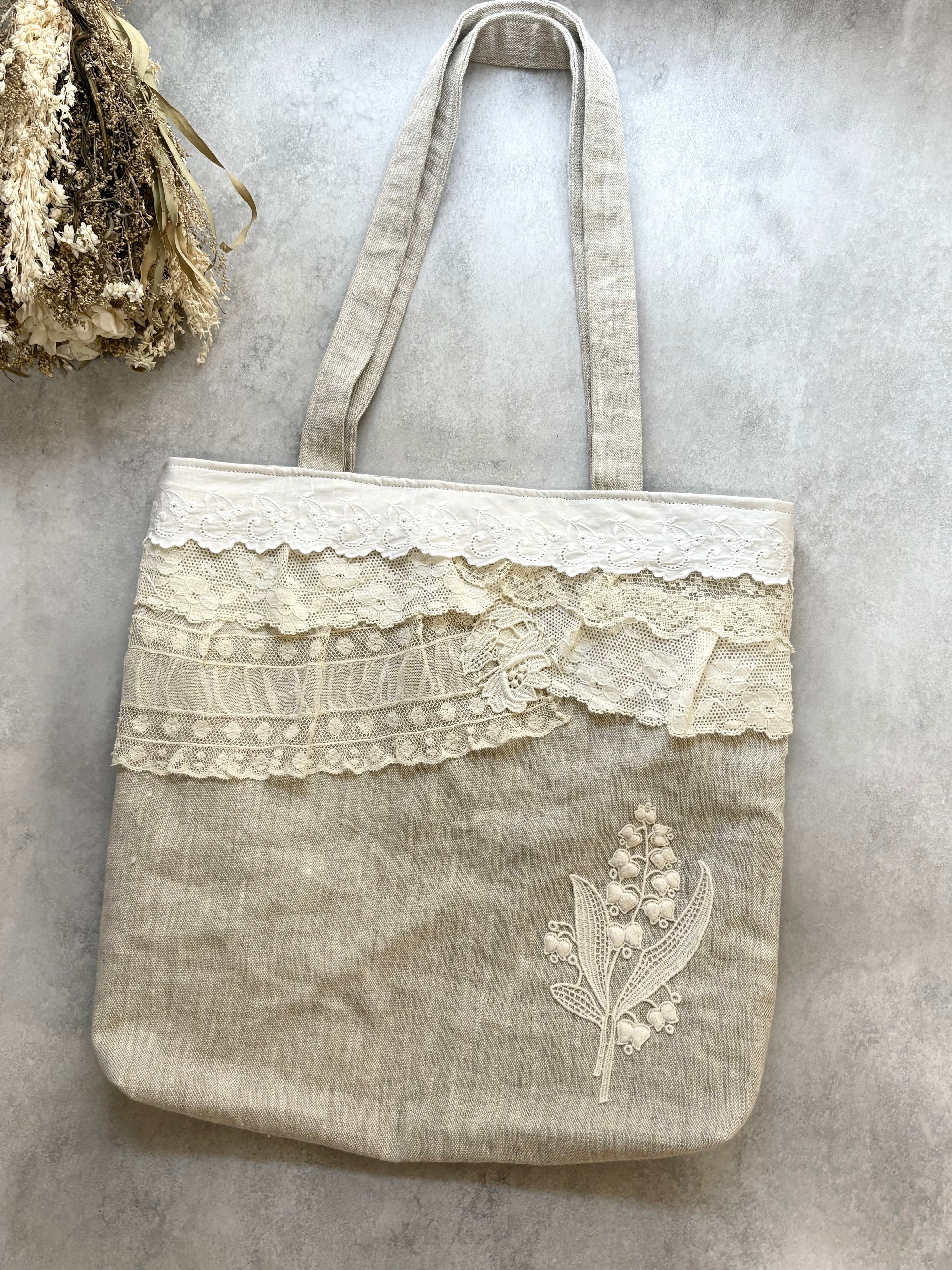 アンティークレースと鈴蘭レースのコラージュトートバッグ