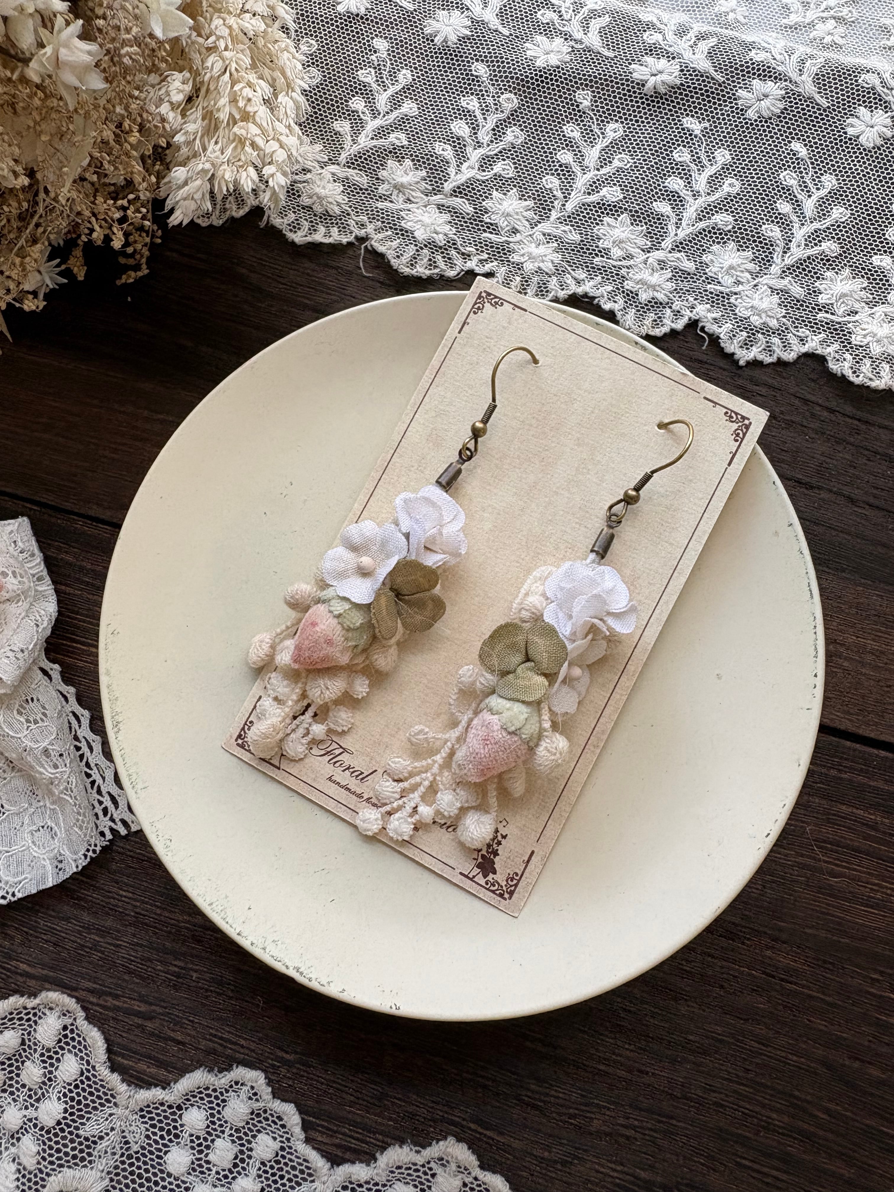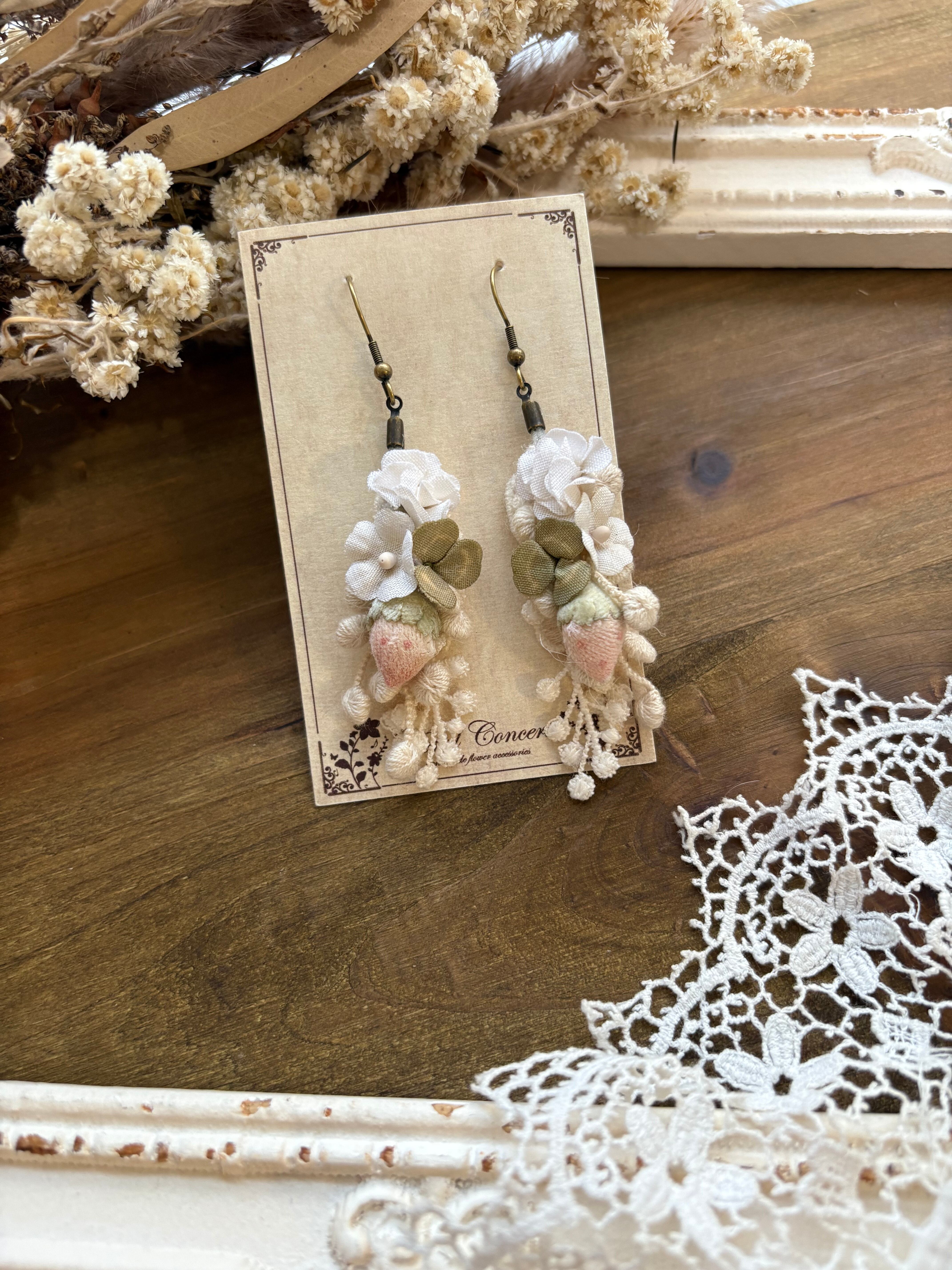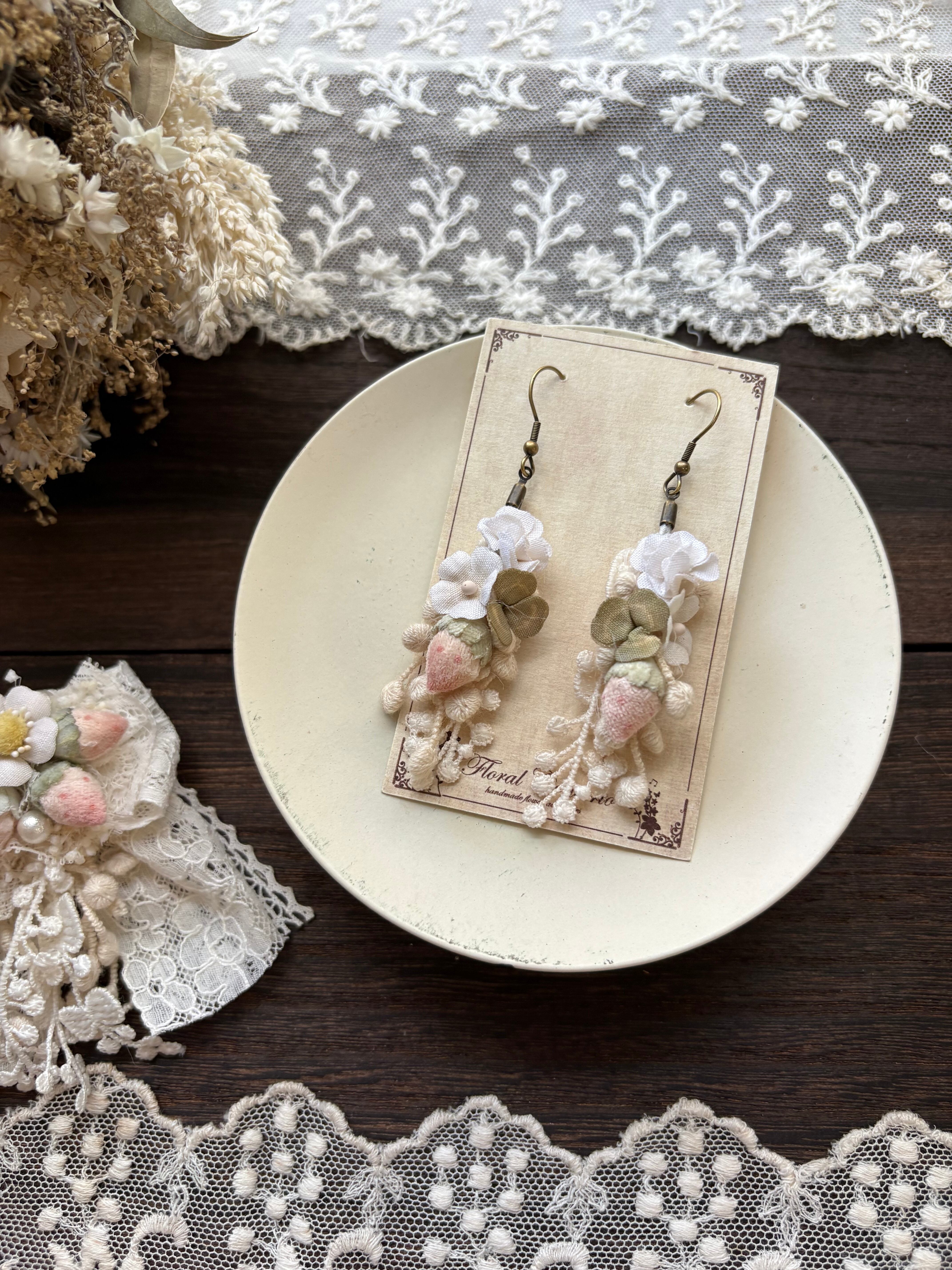 布花のいちごとクローバーの耳飾りです。