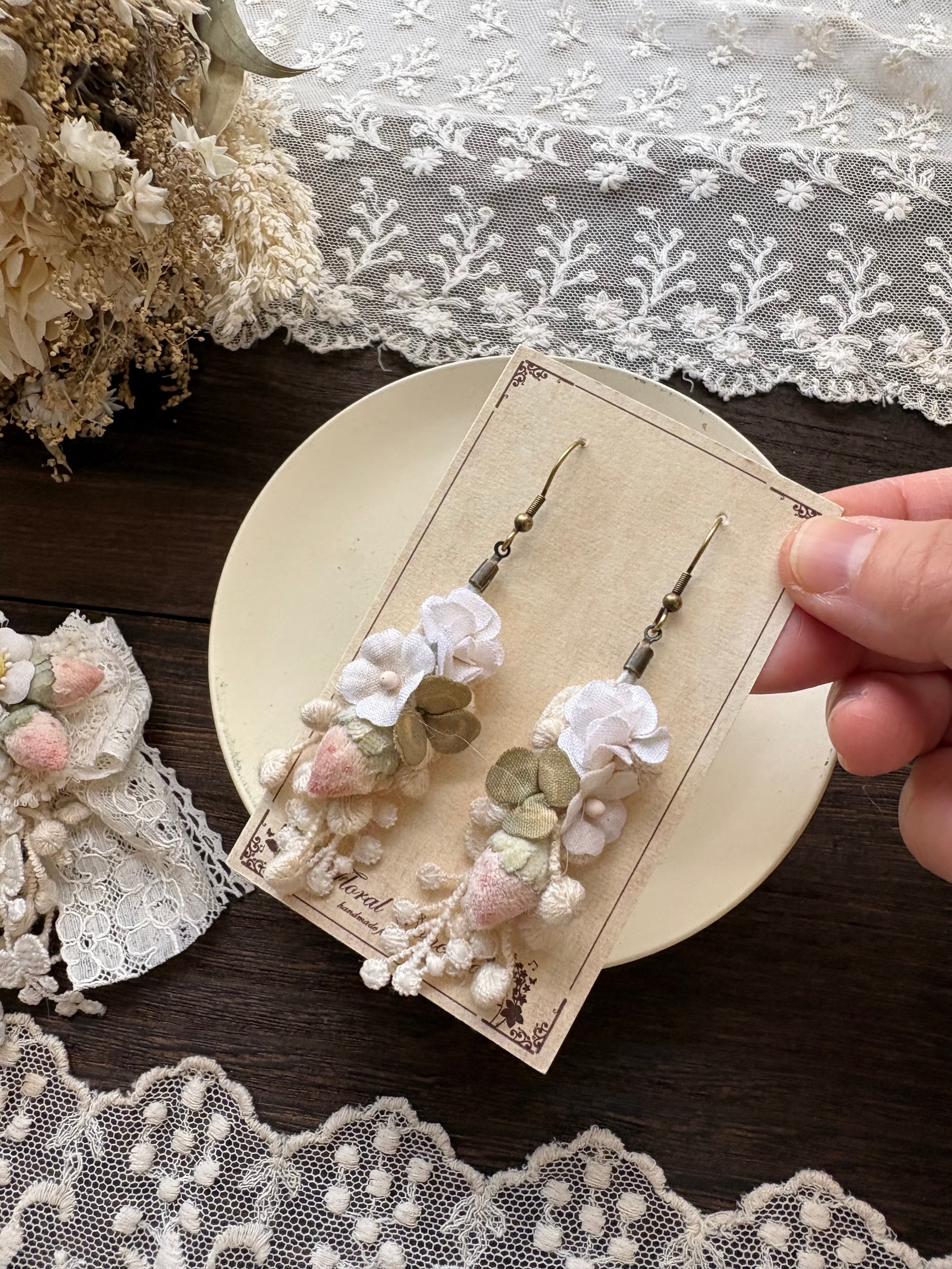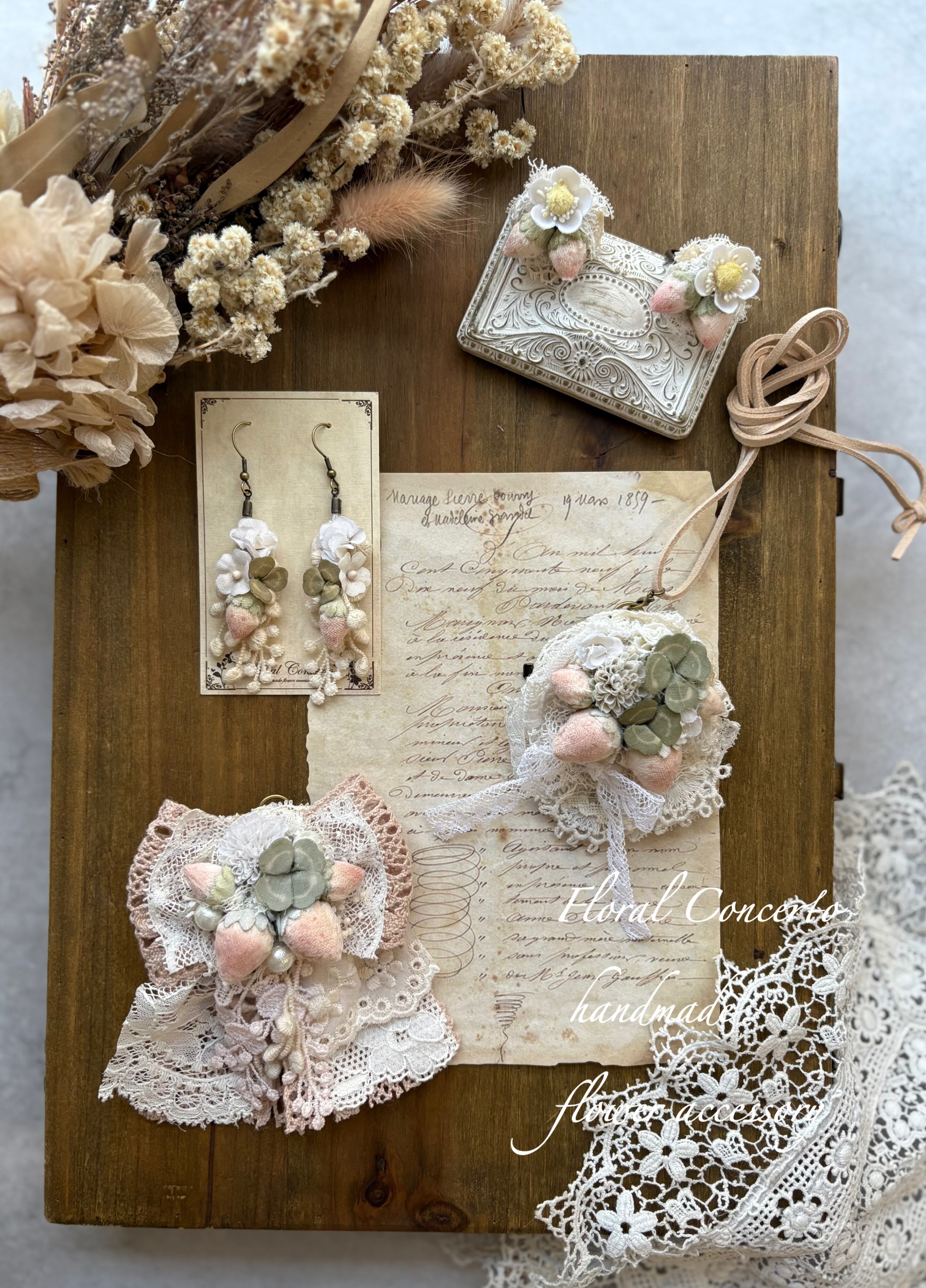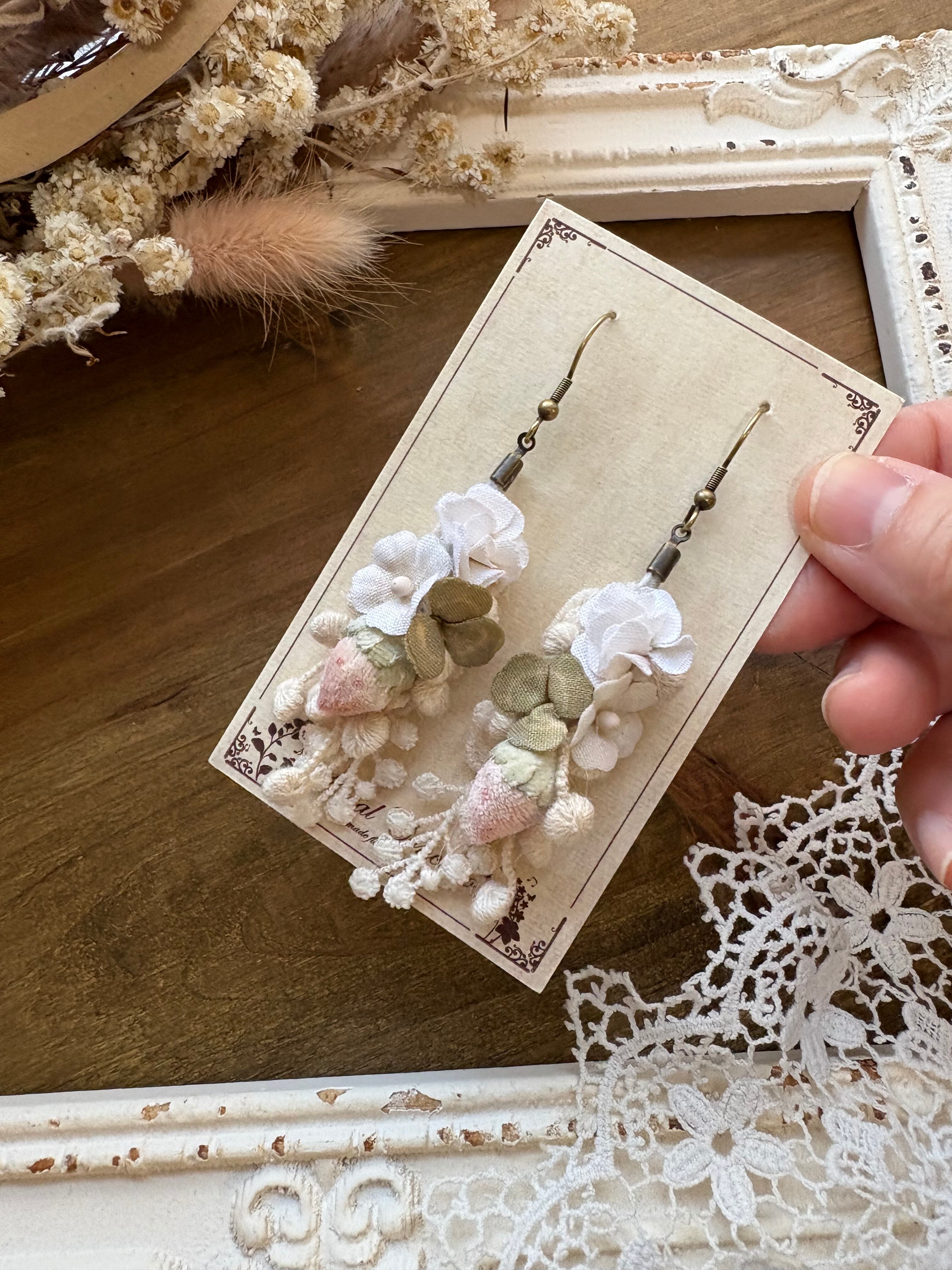 布花のいちごとクローバーの耳飾りです。