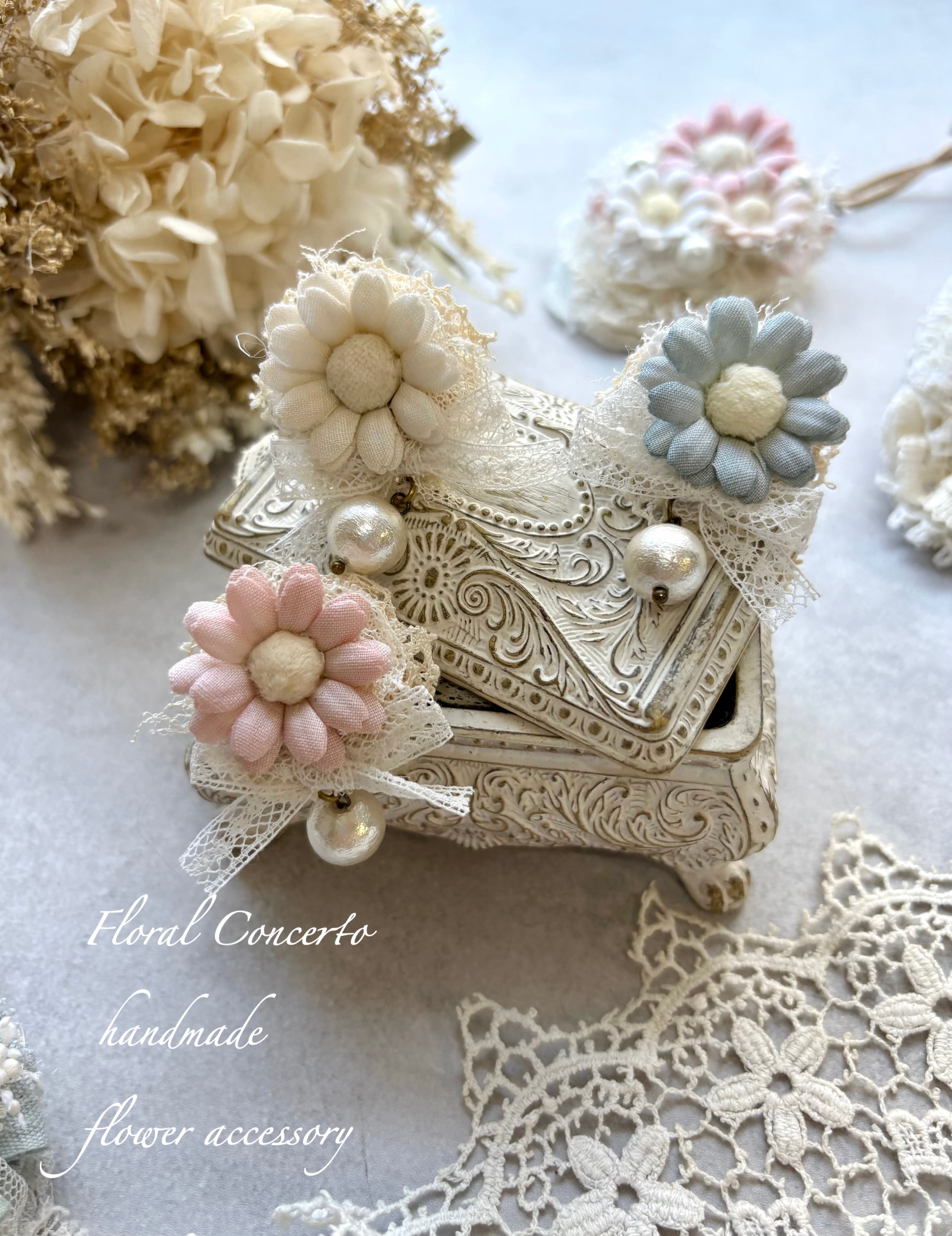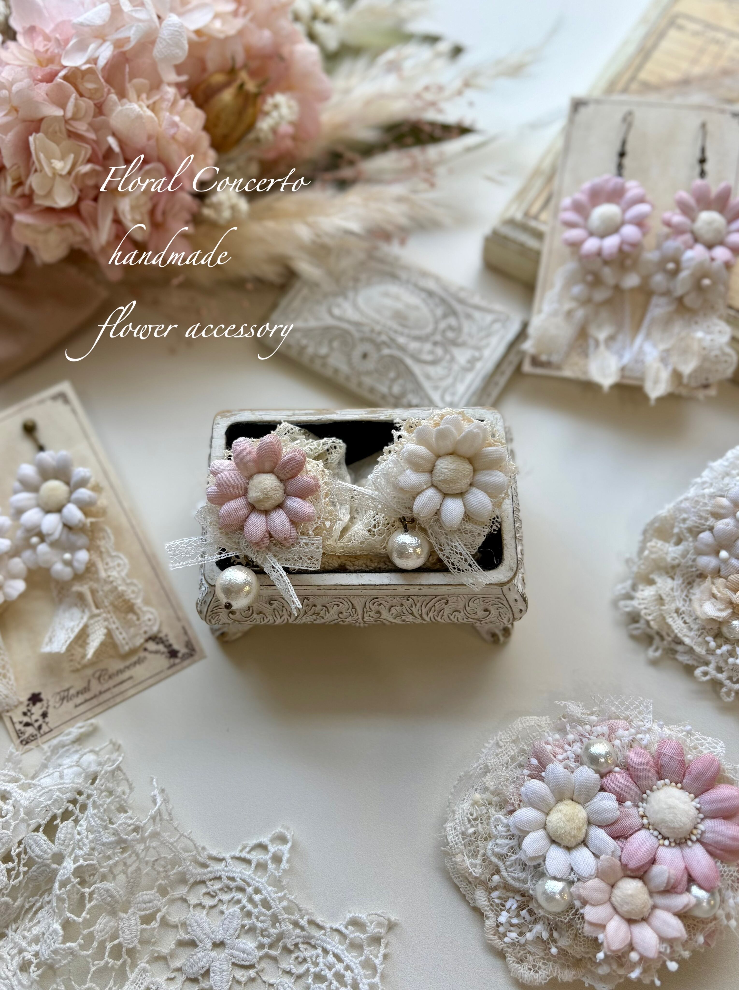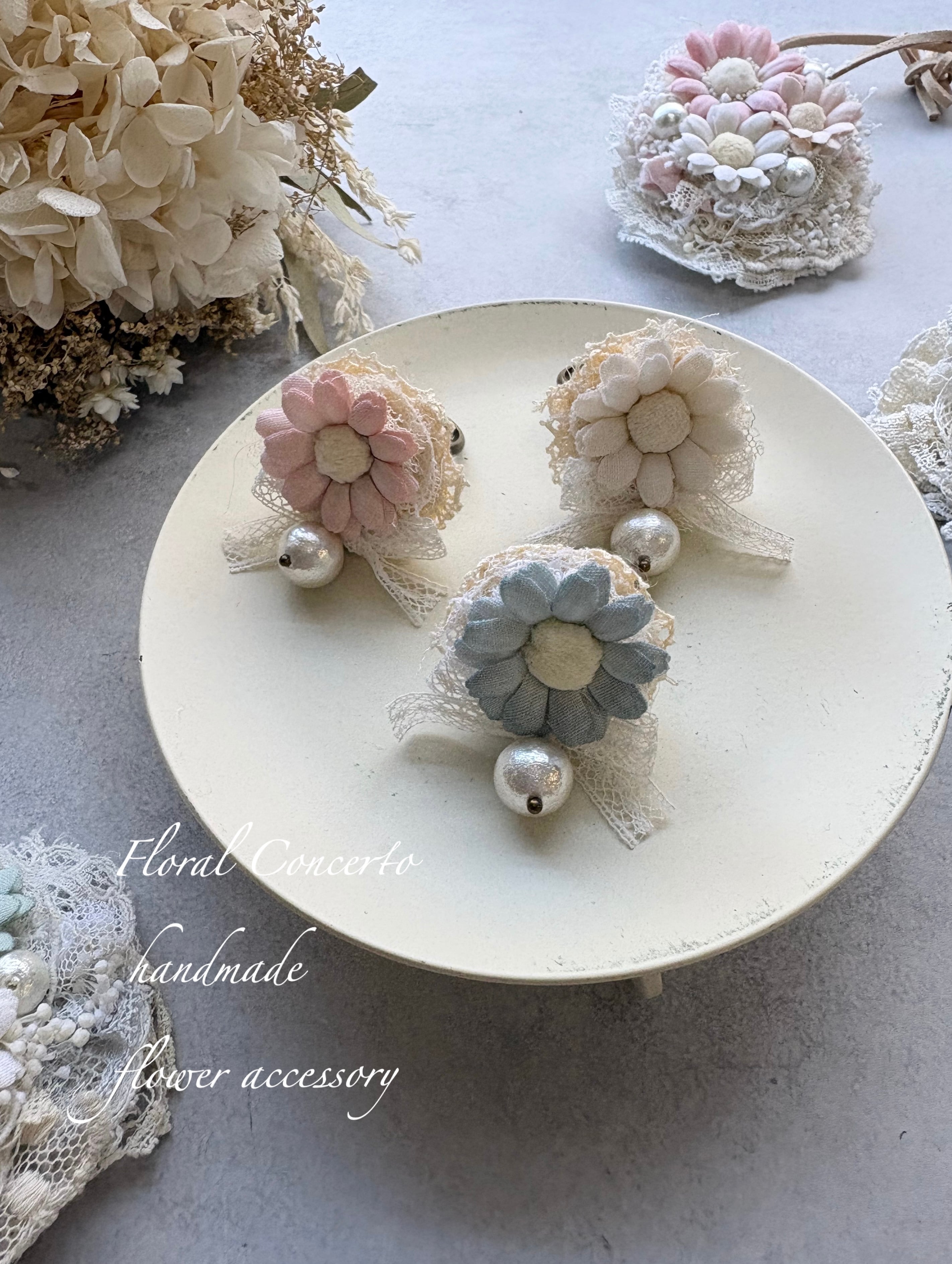 布花は手染めしてコテあてをしてお花に成形しております。
