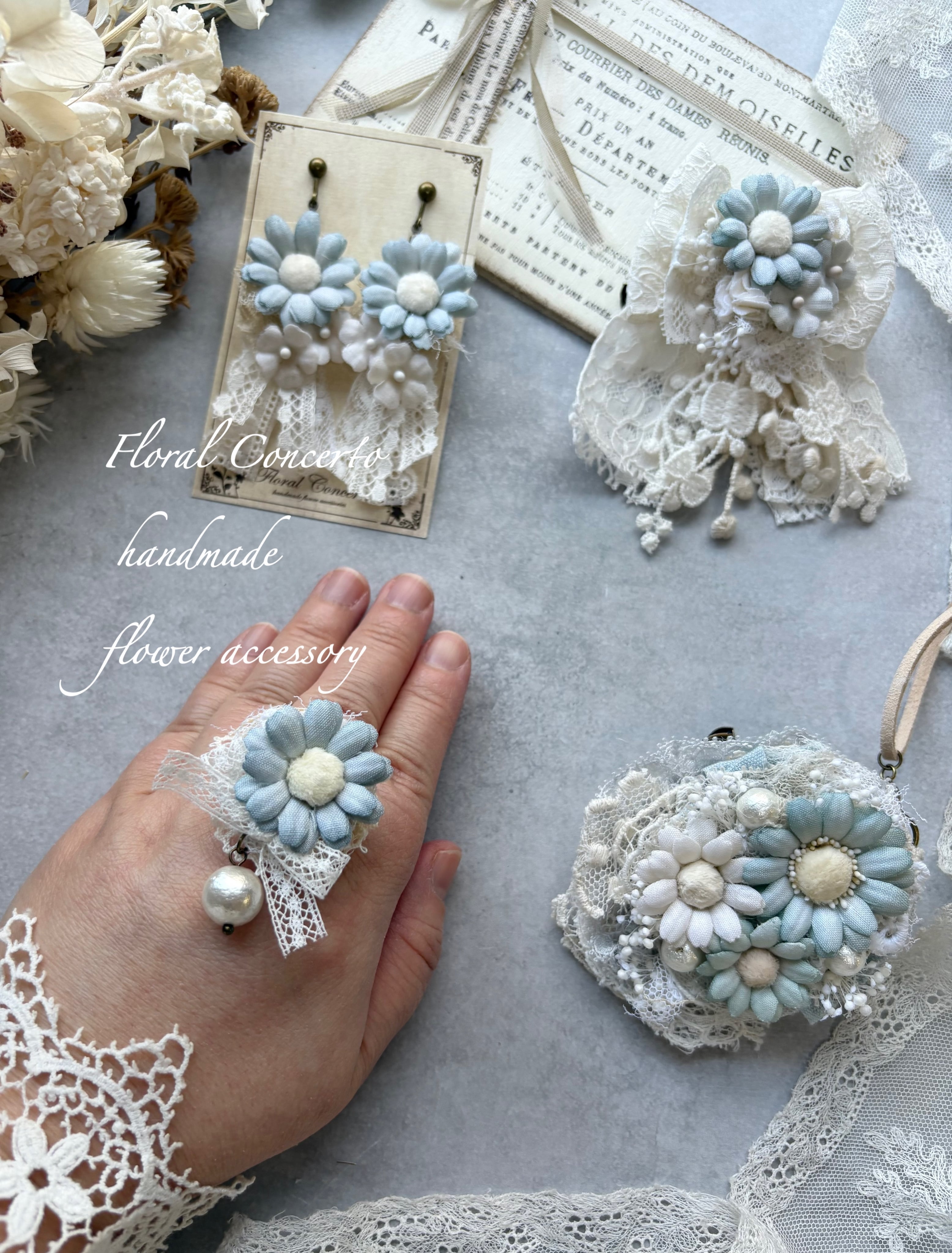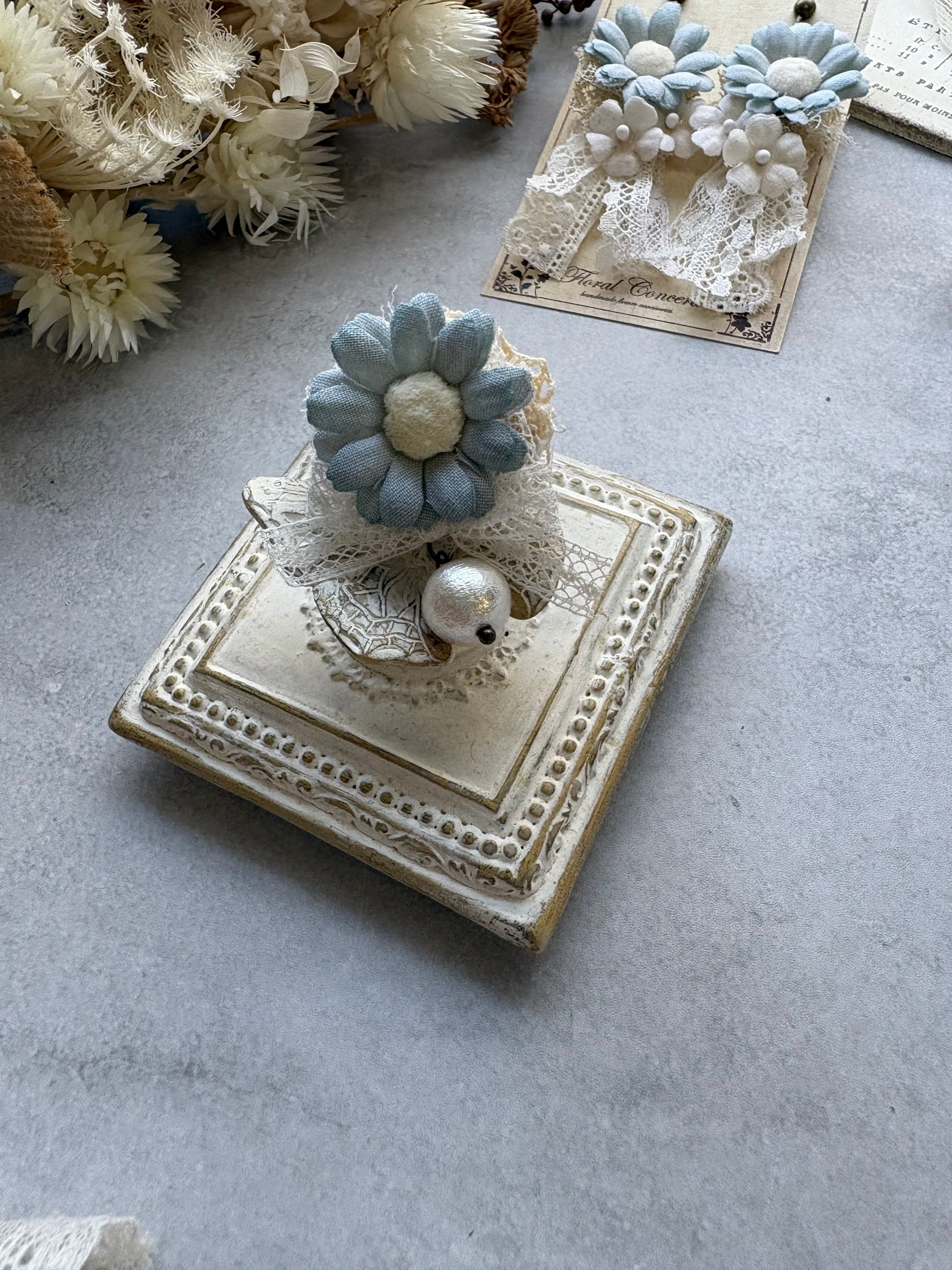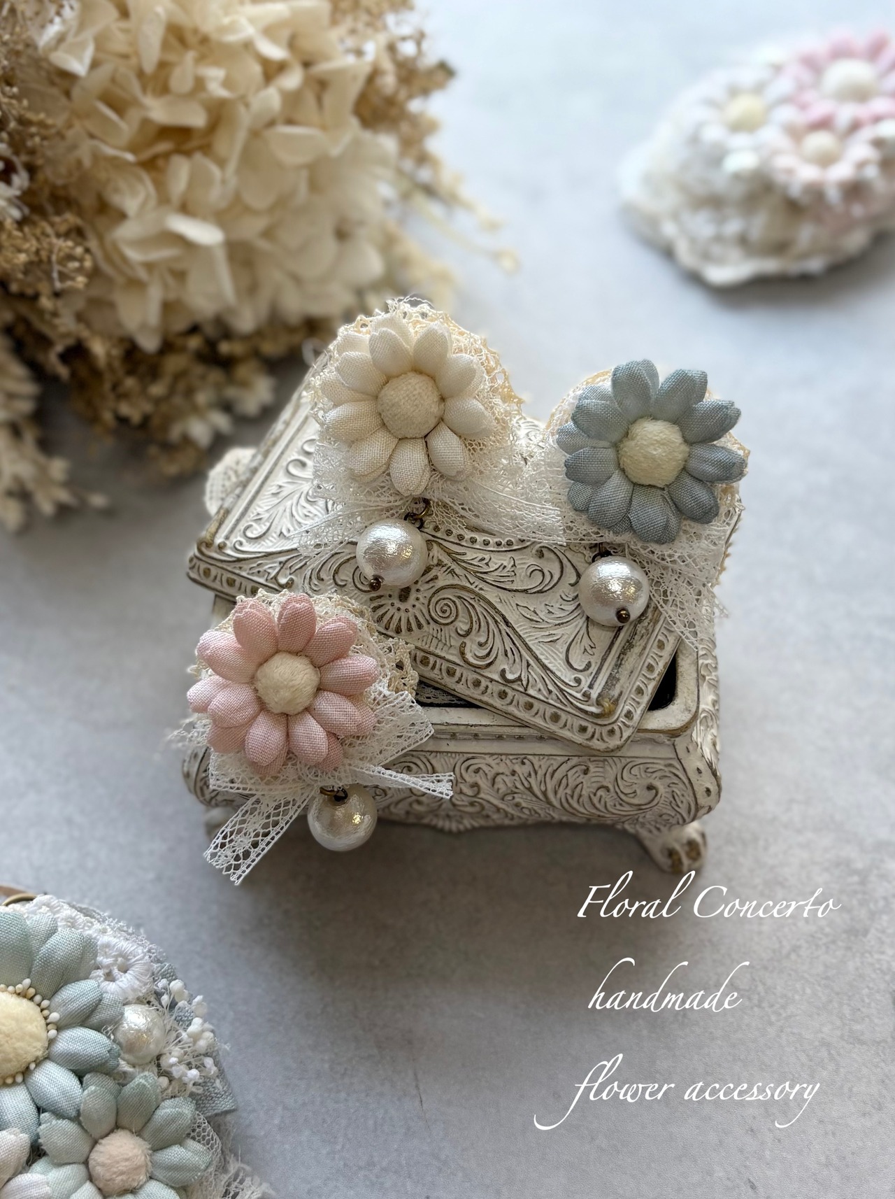 布花は手染めしてコテあてをしてお花に成形しております。
