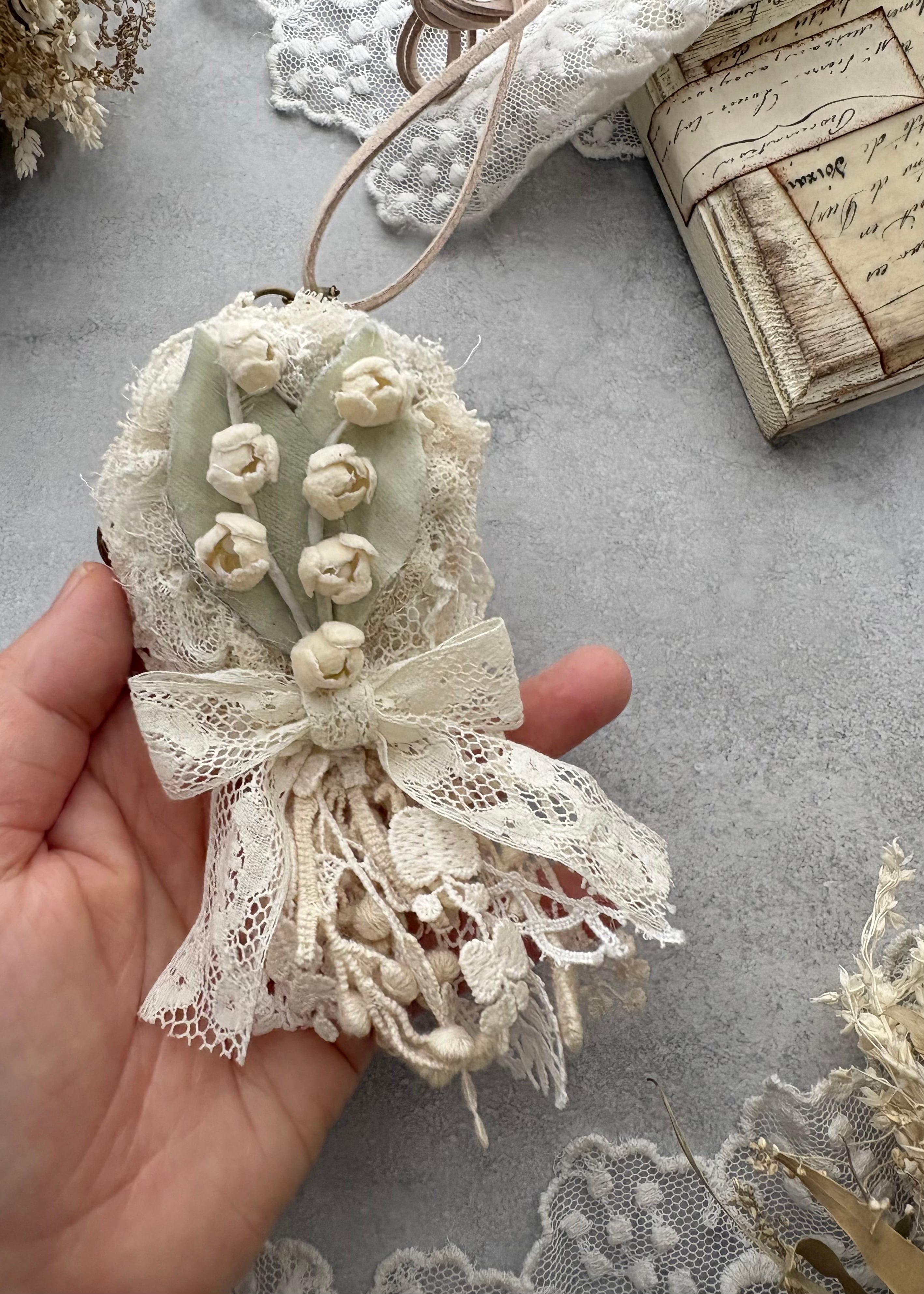 花びら1枚1枚手染めしたお花と葉っぱにアンティークレースをあしらっています。