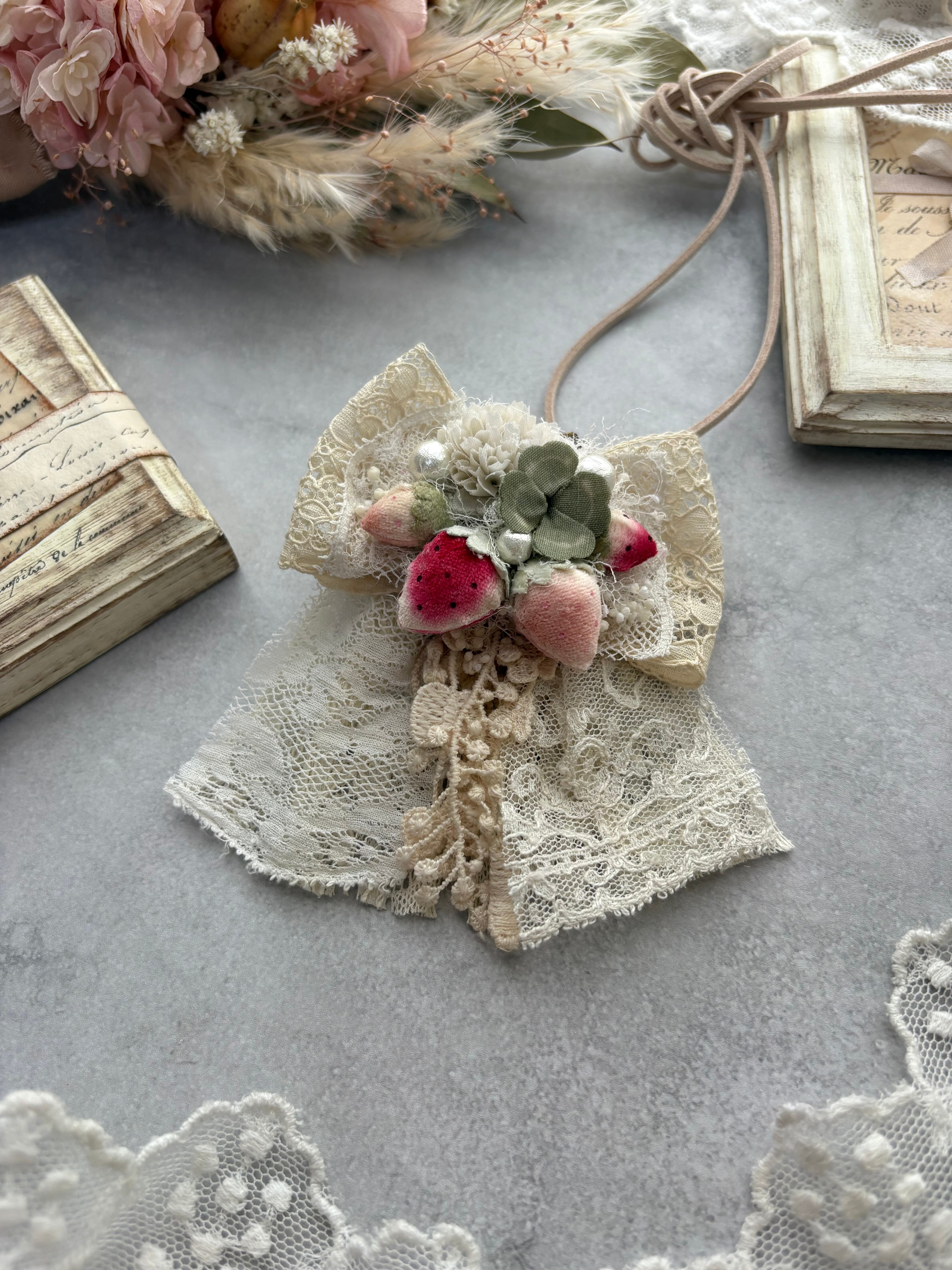 いちごと白詰草のリボン型3wayネックレス(赤いちご)