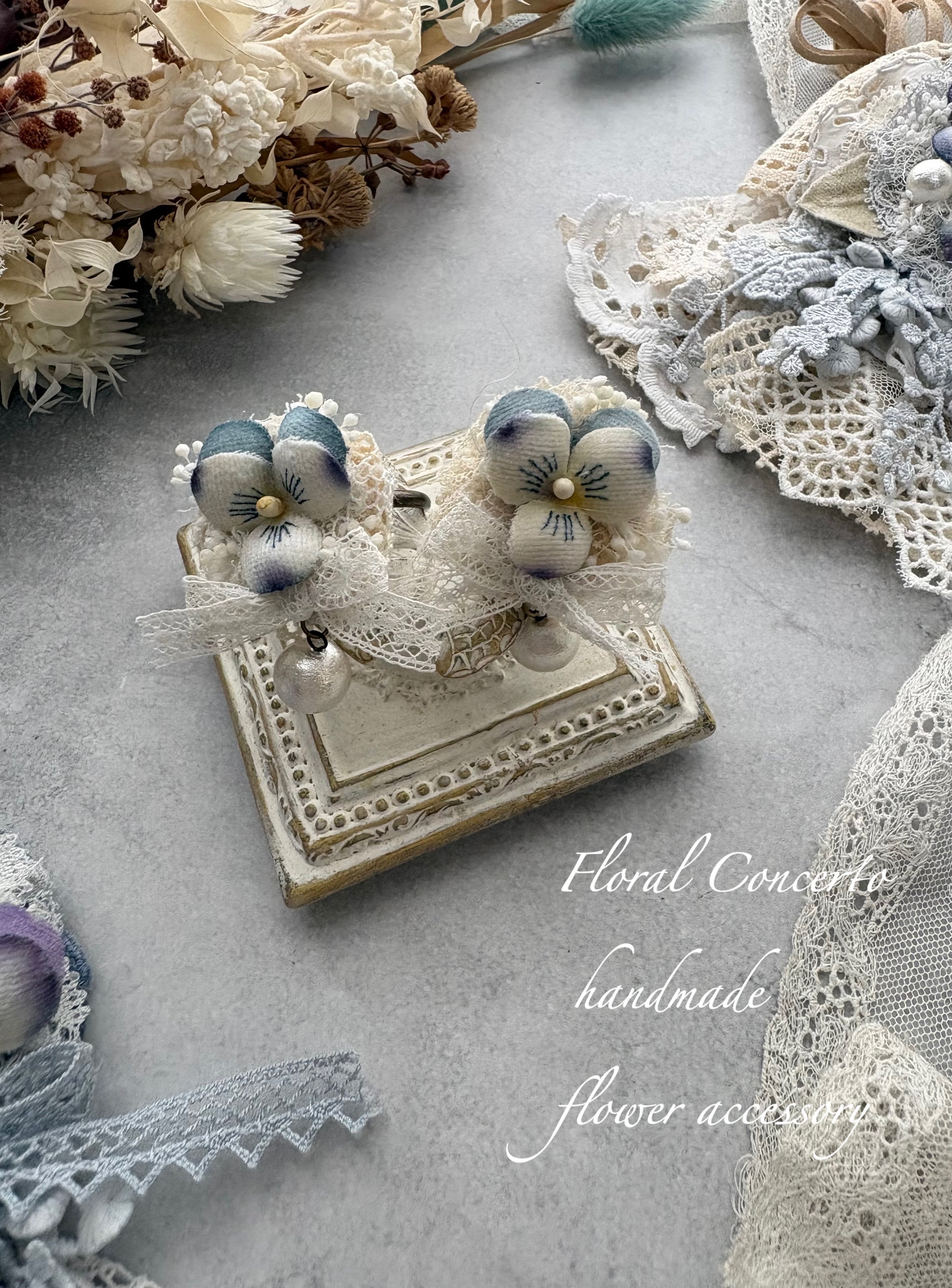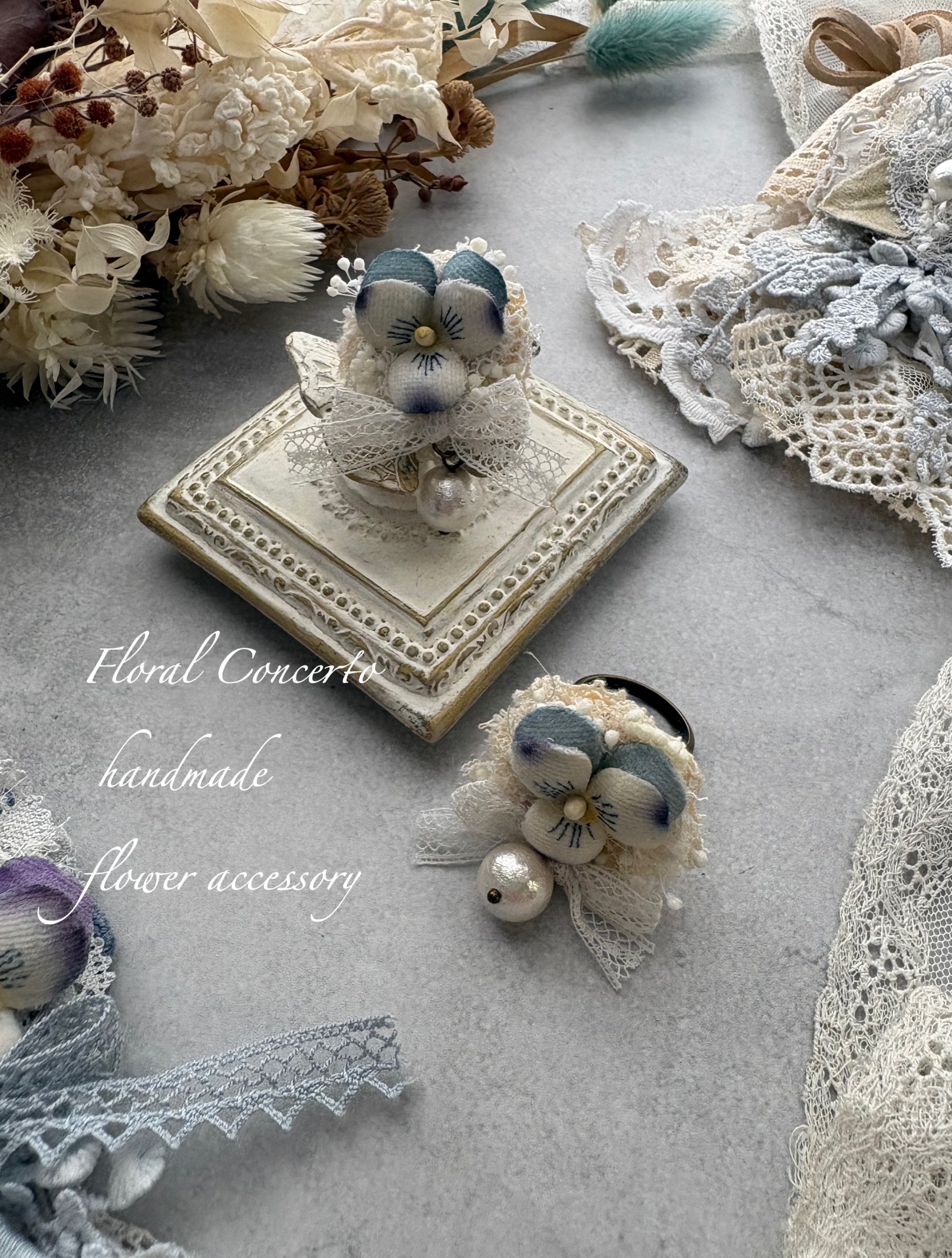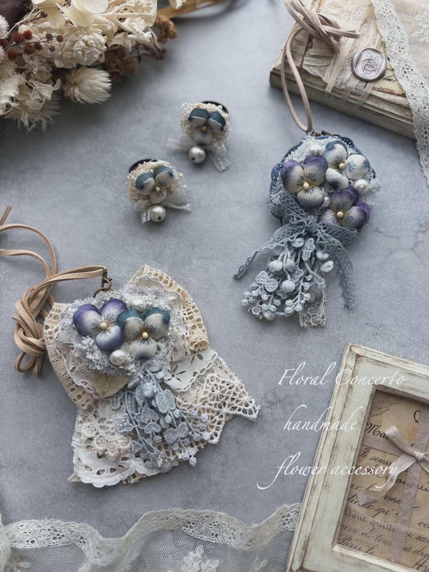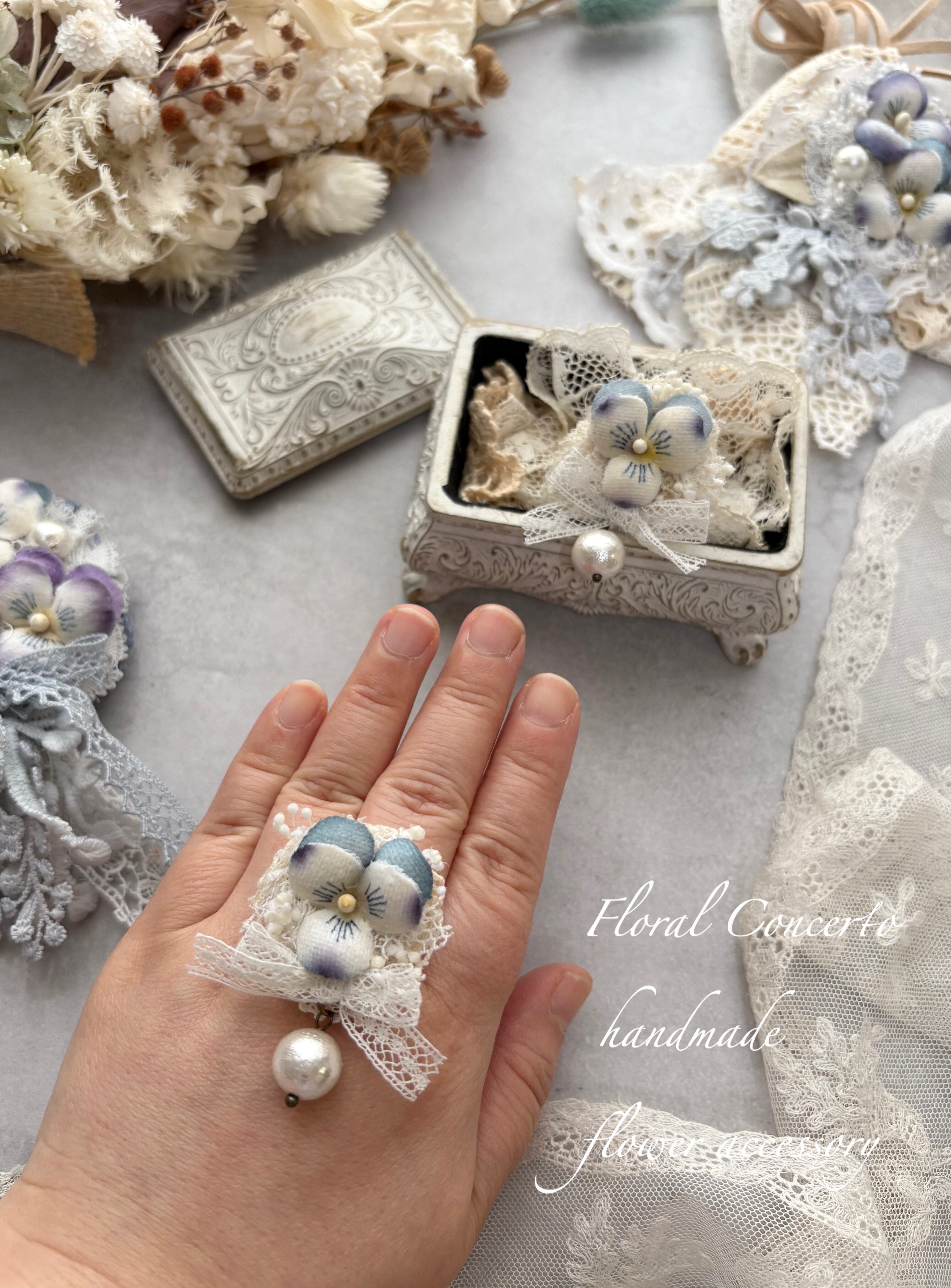 布花のビオラとリボンとコットンパールのリングです。