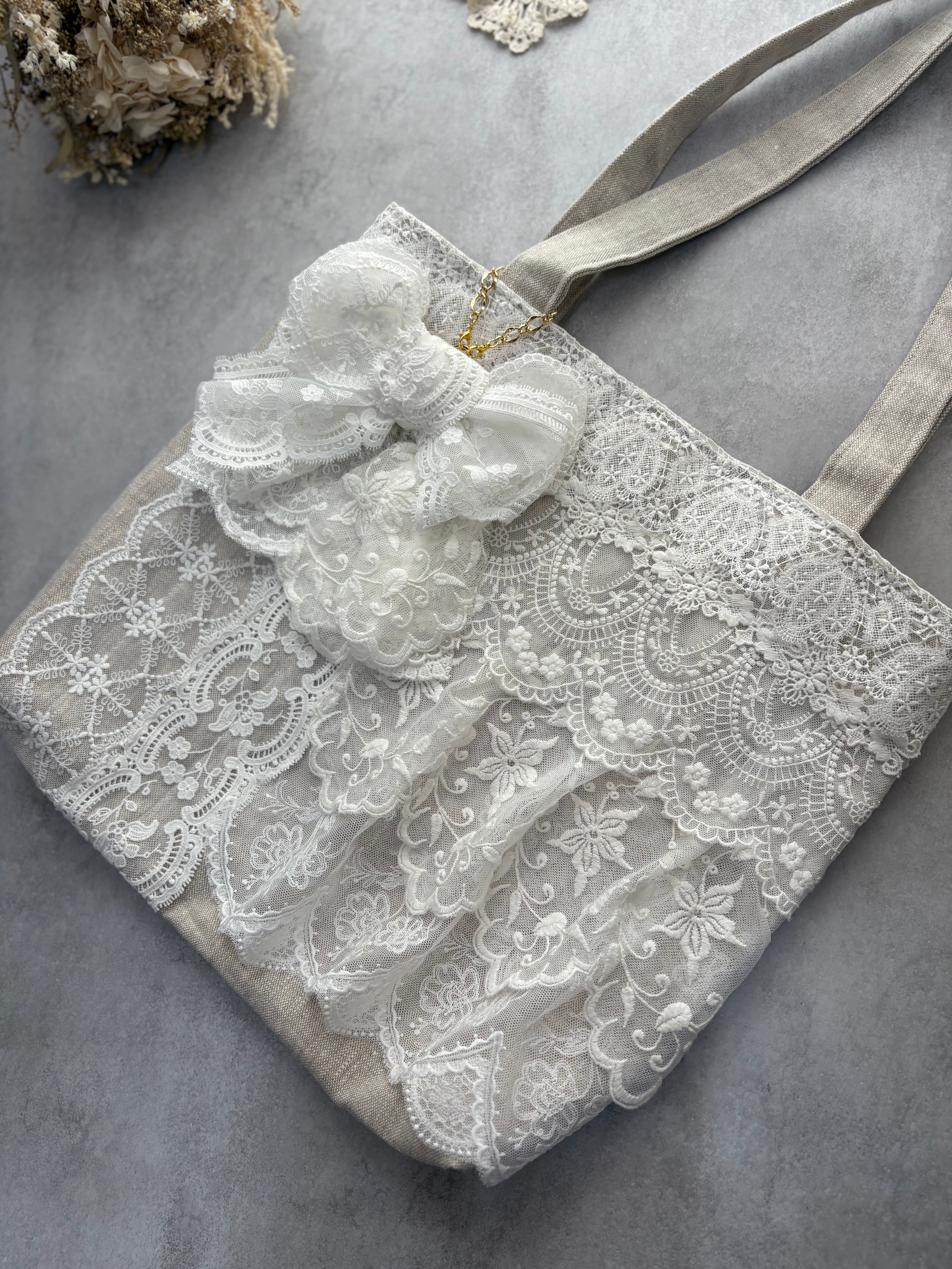 リネン100の生地で作ったトートバッグに、レースコラージュしました。