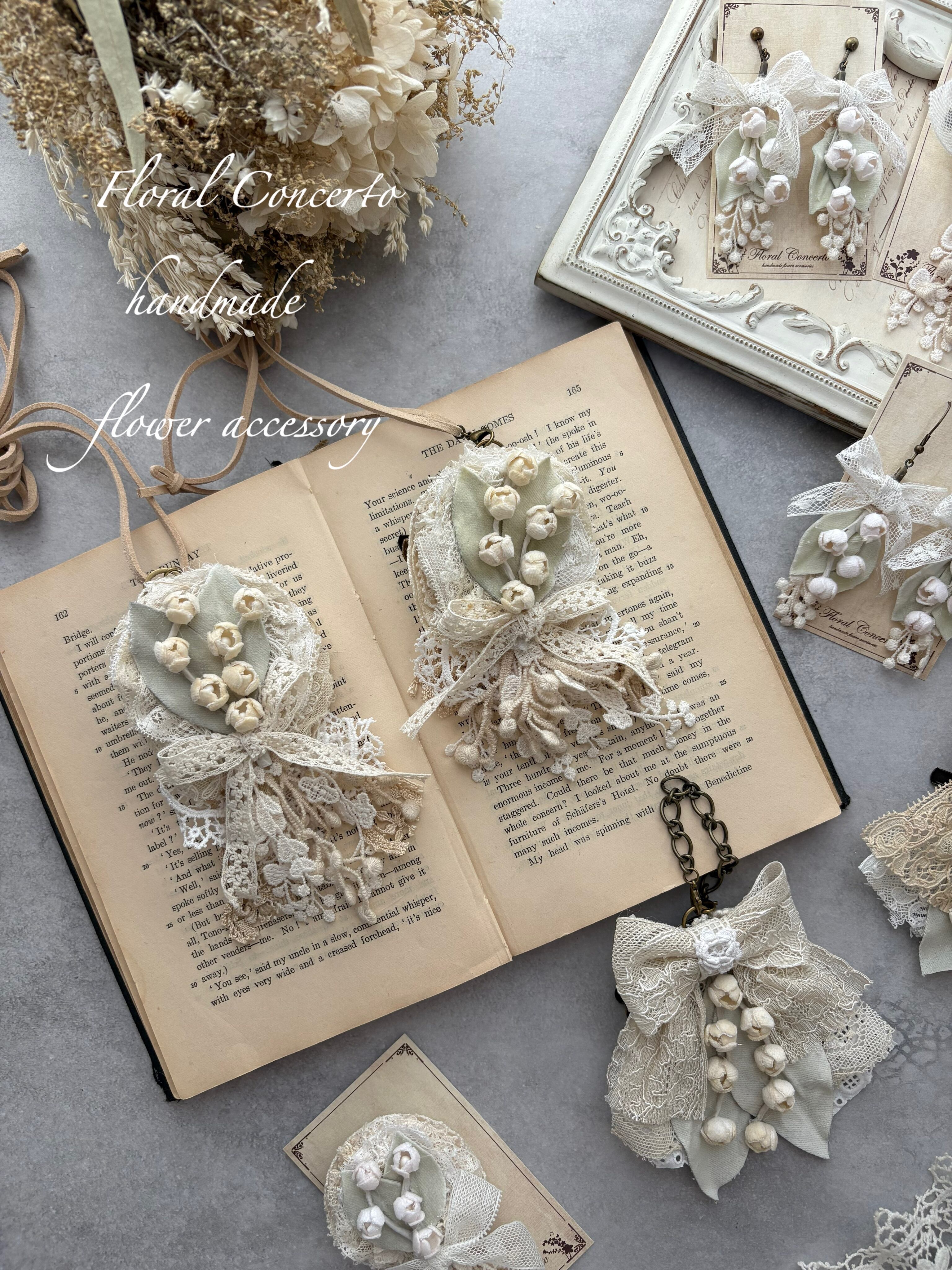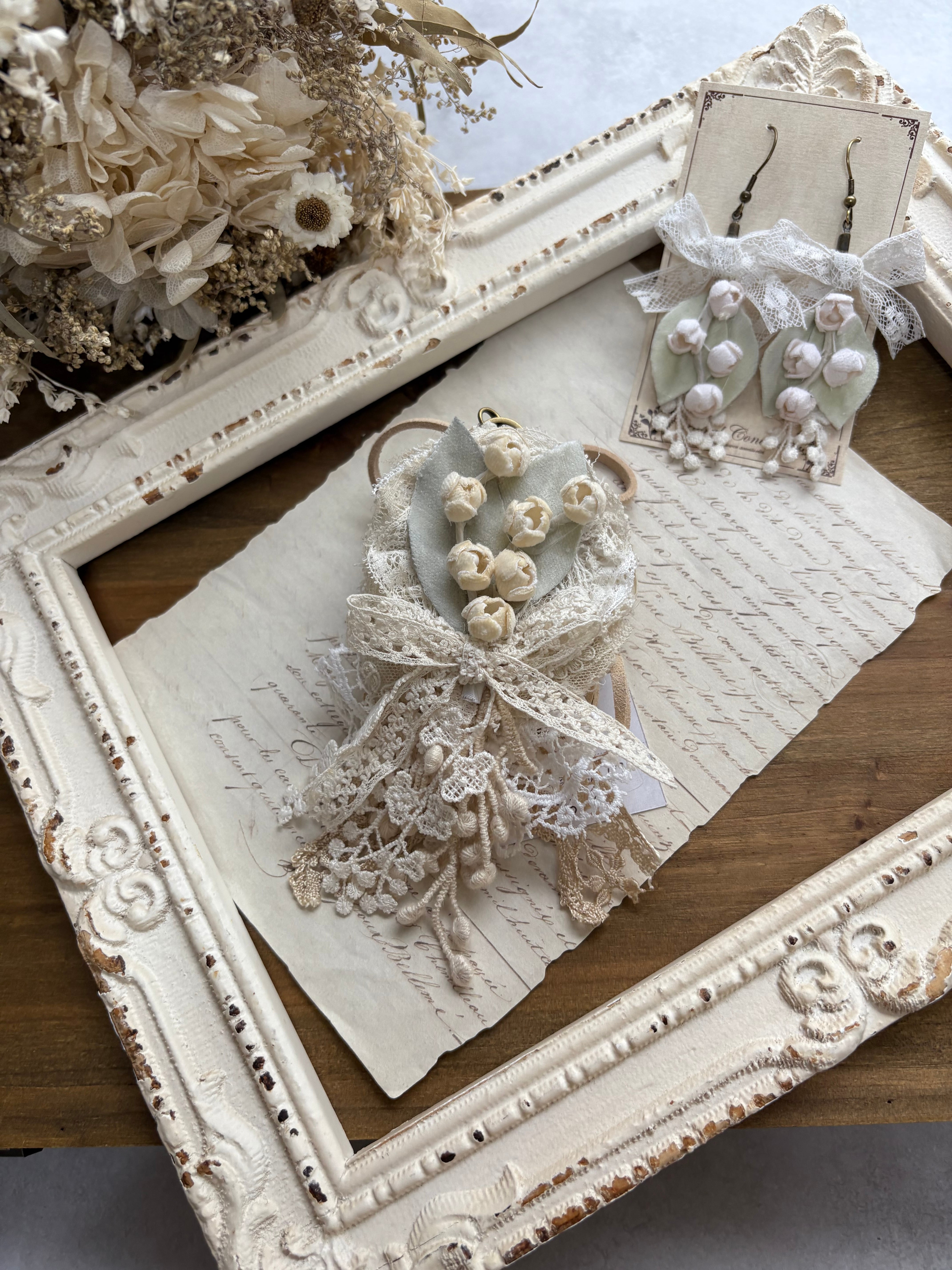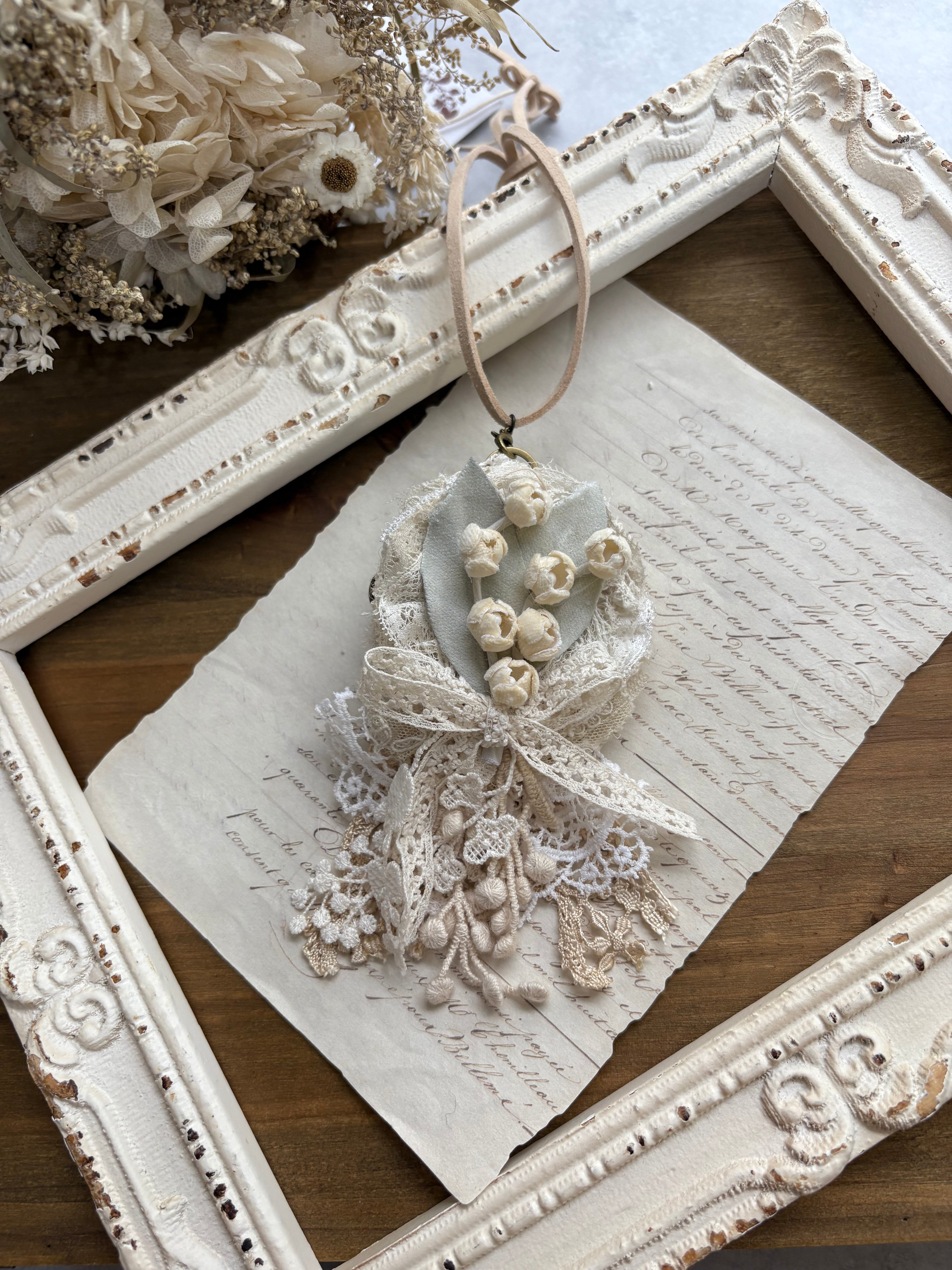 花びら1枚1枚手染めしたお花と葉っぱにアンティークレースをあしらっています。