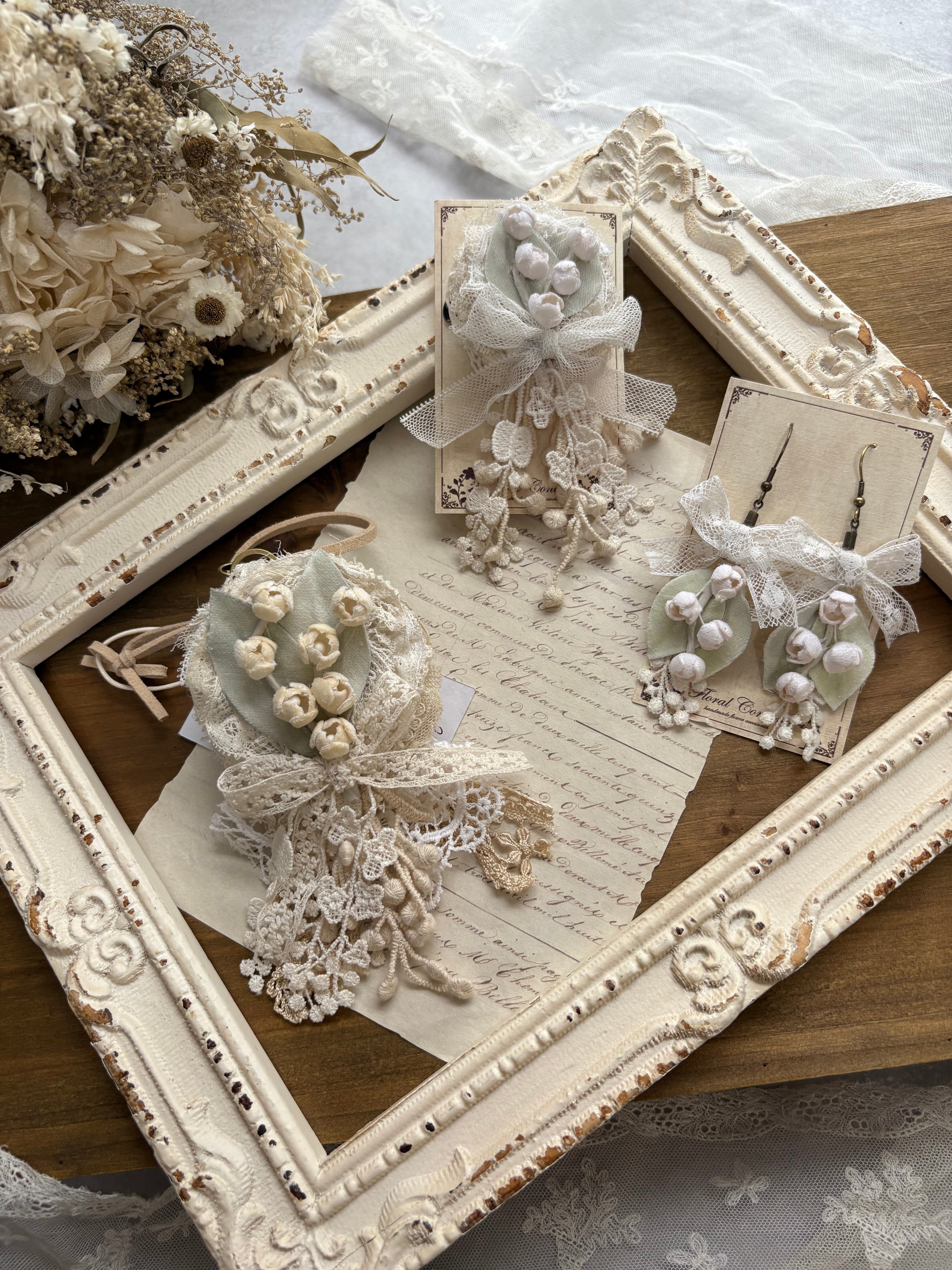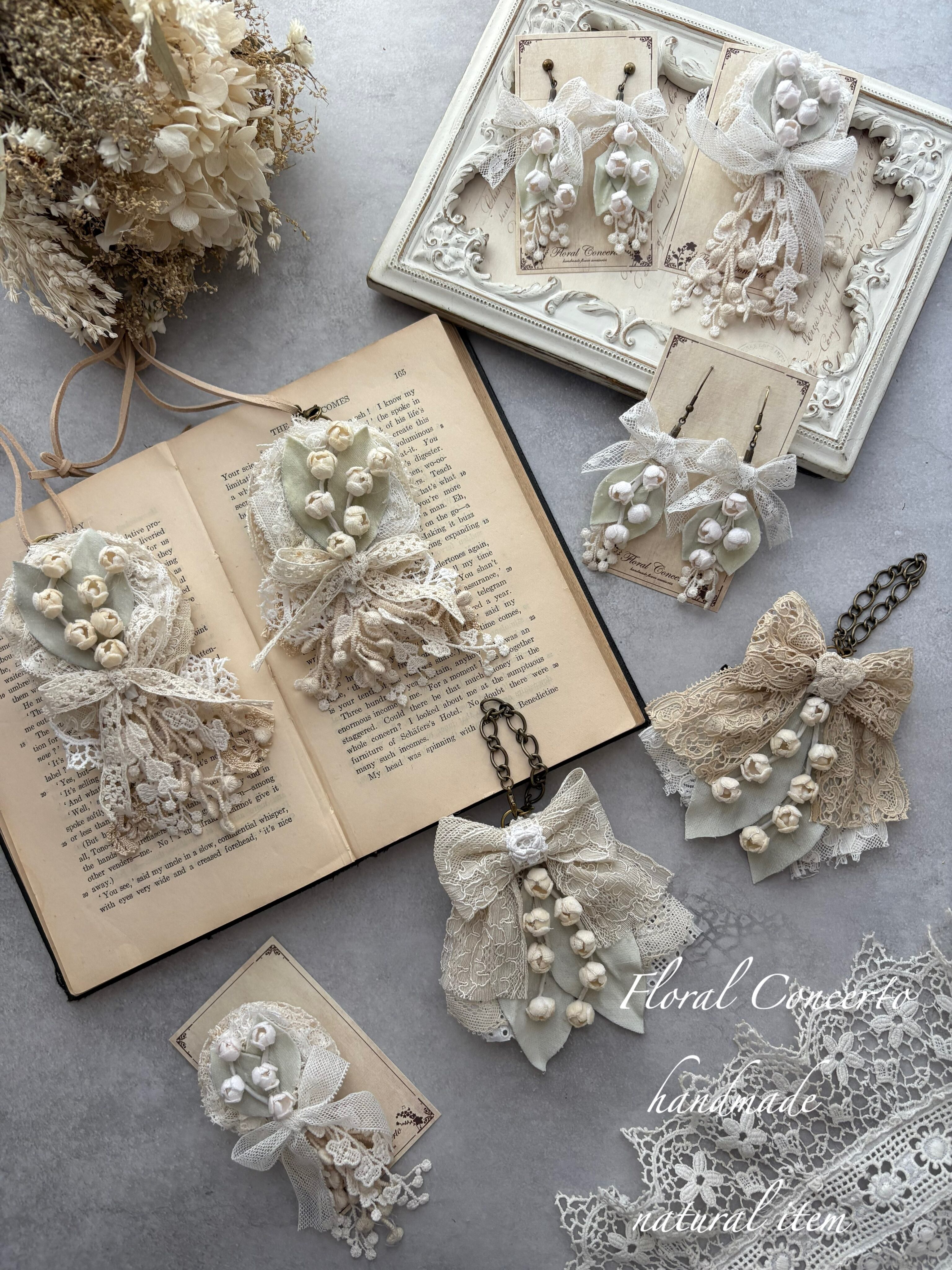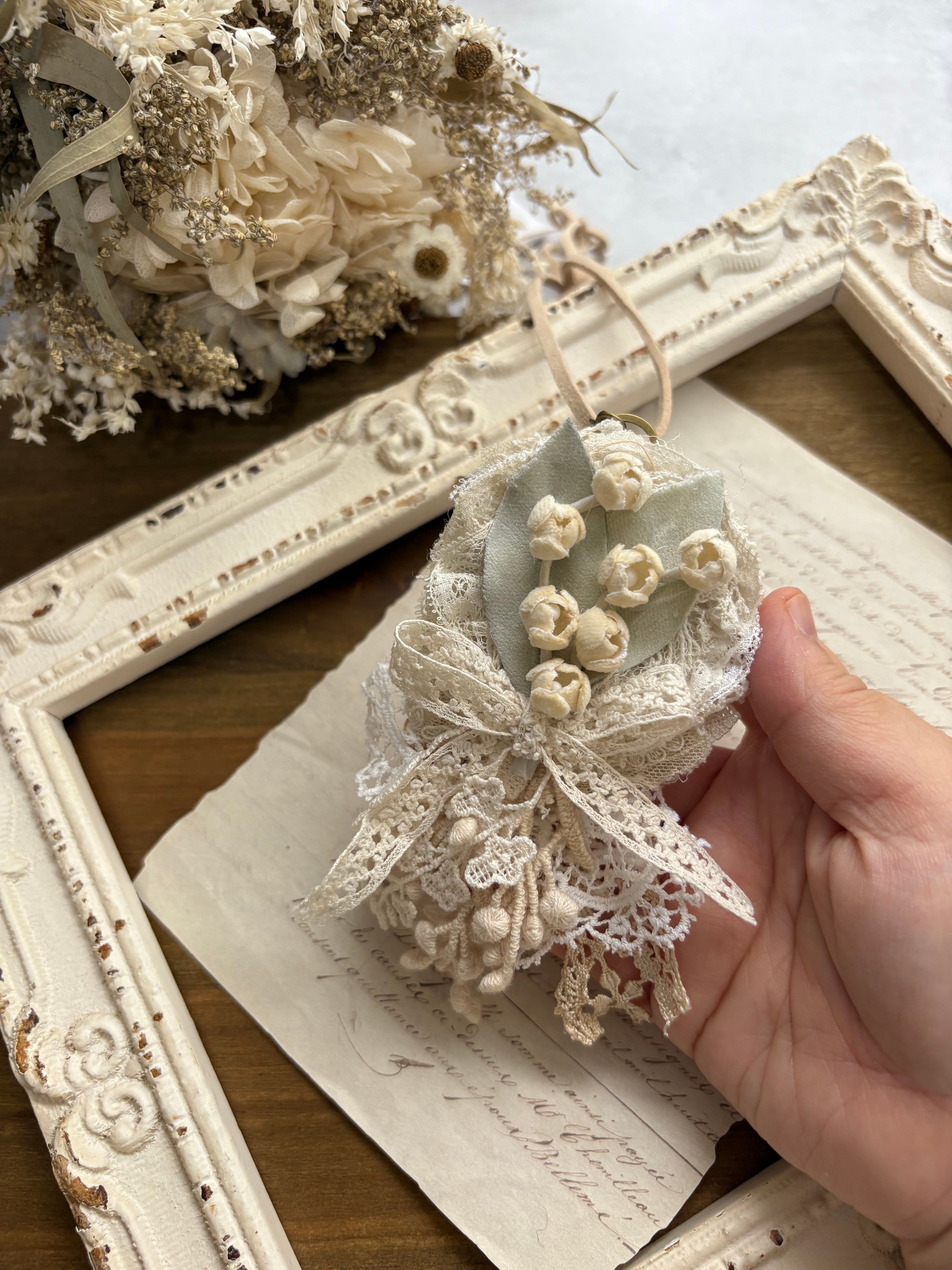 花びら1枚1枚手染めしたお花と葉っぱにアンティークレースをあしらっています。